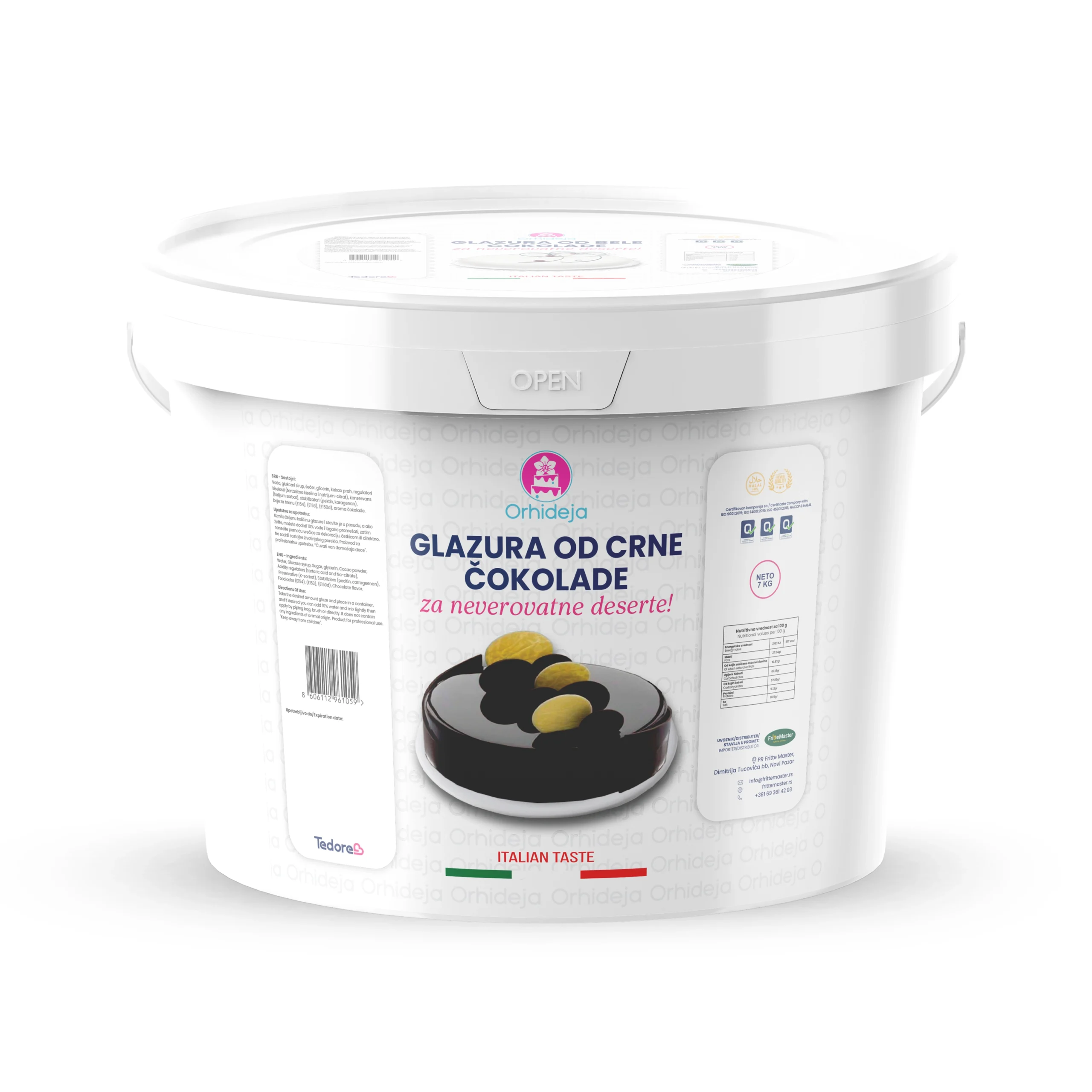 Glazura od crne čokolade 7 kg je pravi izbor za poslastičare koji žele da svoje kreacije obogate sa prelepim, dubokim sjajem. Ova spremna za upotrebu glazura stvara efekat ogledalskog sjaja, koji će vašim desertima pružiti sofisticirani i luksuzni izgled. Njena bogata ukusna dubina crne čokolade savršeno se uklapa sa raznim vrstama poslastica, bilo da je koristite za torte, praline, ili sofisticirane kolače.